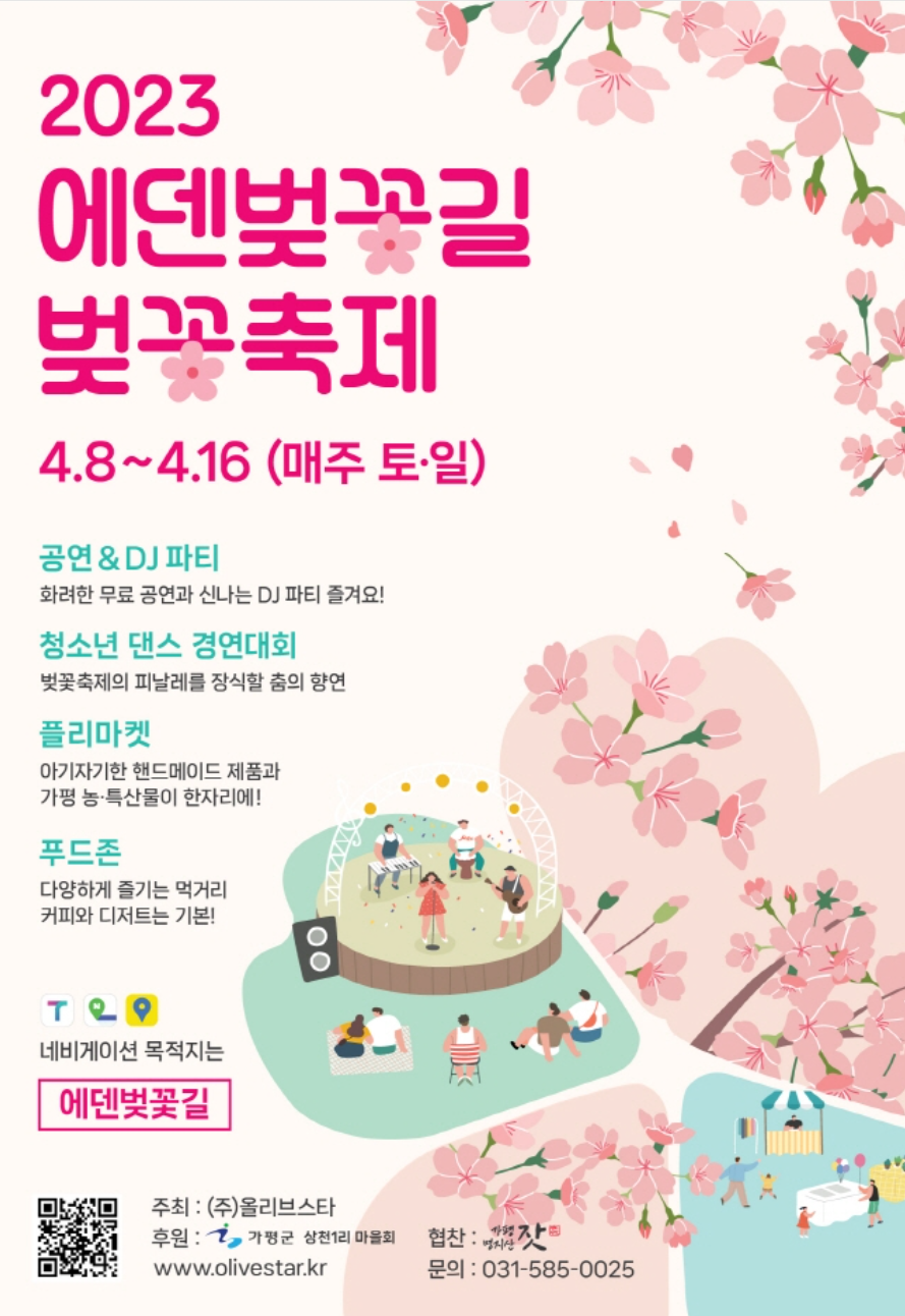 2023 에덴벚꽃길 벚꽃축제는 벚꽃터널뿐만 아니라 클래식과 대중 가요 무대 공연, 플리마켓, 먹거리 등을